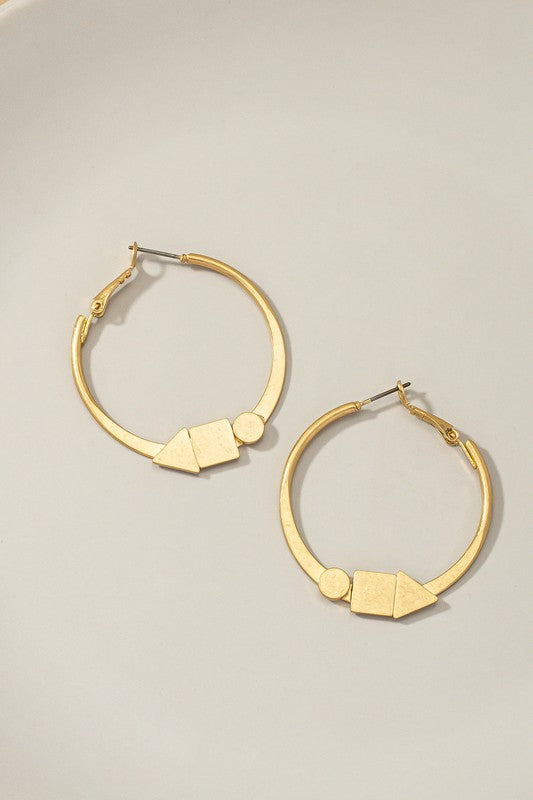 Indulge in the exquisite elegance of our Geo shapes flat hoop earrings. The iron construction, adorned with intricate geometric designs, is coated in a luxurious worn gold plating. With a size of 1.50", these hoops are a must-have for any sophisticated jewelry collection.