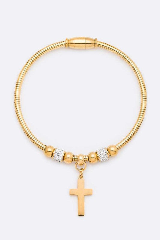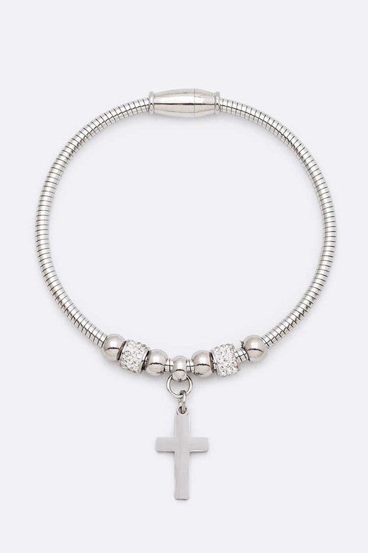 Add a touch of faith to your style with our Stainless Steel Cross Charm Magnetic Bracelet. The stainless steel material ensures durability, while the magnetic closure provides convenience. Embrace good vibes and effortless style with this bracelet. Width - 0.25"Magnetic ClosureLead & Nickel C...