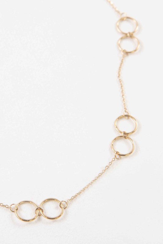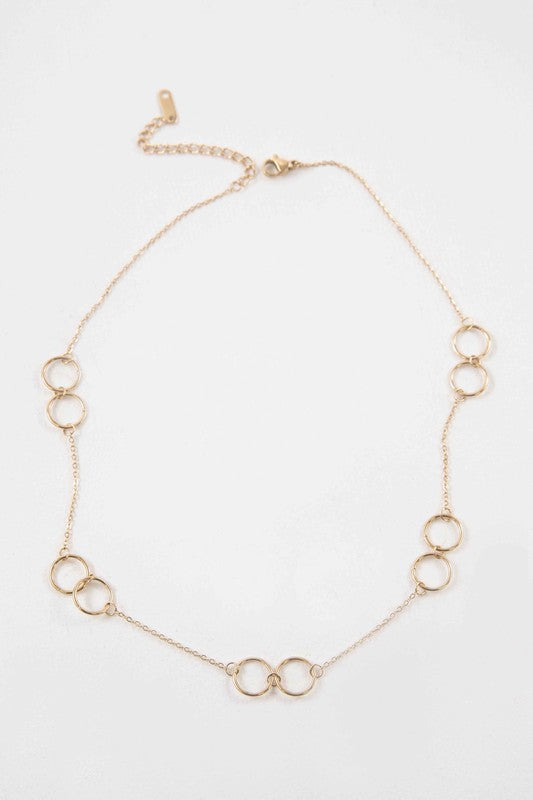 Add a touch of whimsy to any outfit with our DOUBLE CIRCLE NECKLACE. This unique piece features two intertwined circles for a playful and stylish look. Perfect for everyday wear or adding a pop of fun to a special occasion.- Lobster clasp Gold plated stainless steel Matching gold stud earrings ...