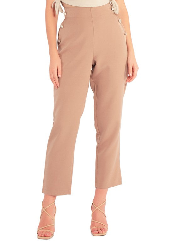 These straight-cut trousers pants are perfect for staying stylish and street smart. They feature two side pockets with three stone button details, as well as two back pockets. Plus, the elasticated waist adds extra comfort.Rise: Mid RiseLength: Ankle-LengthFit: Straight FitElasticated WaistJewel ...